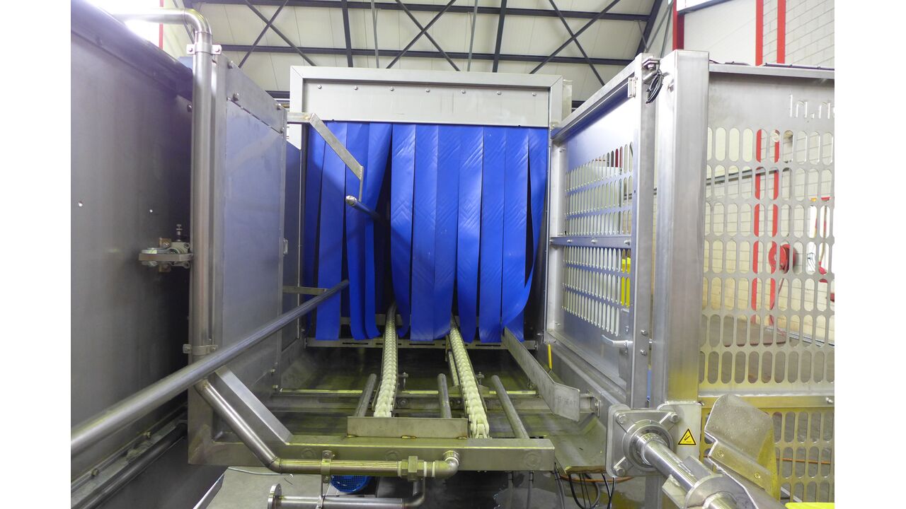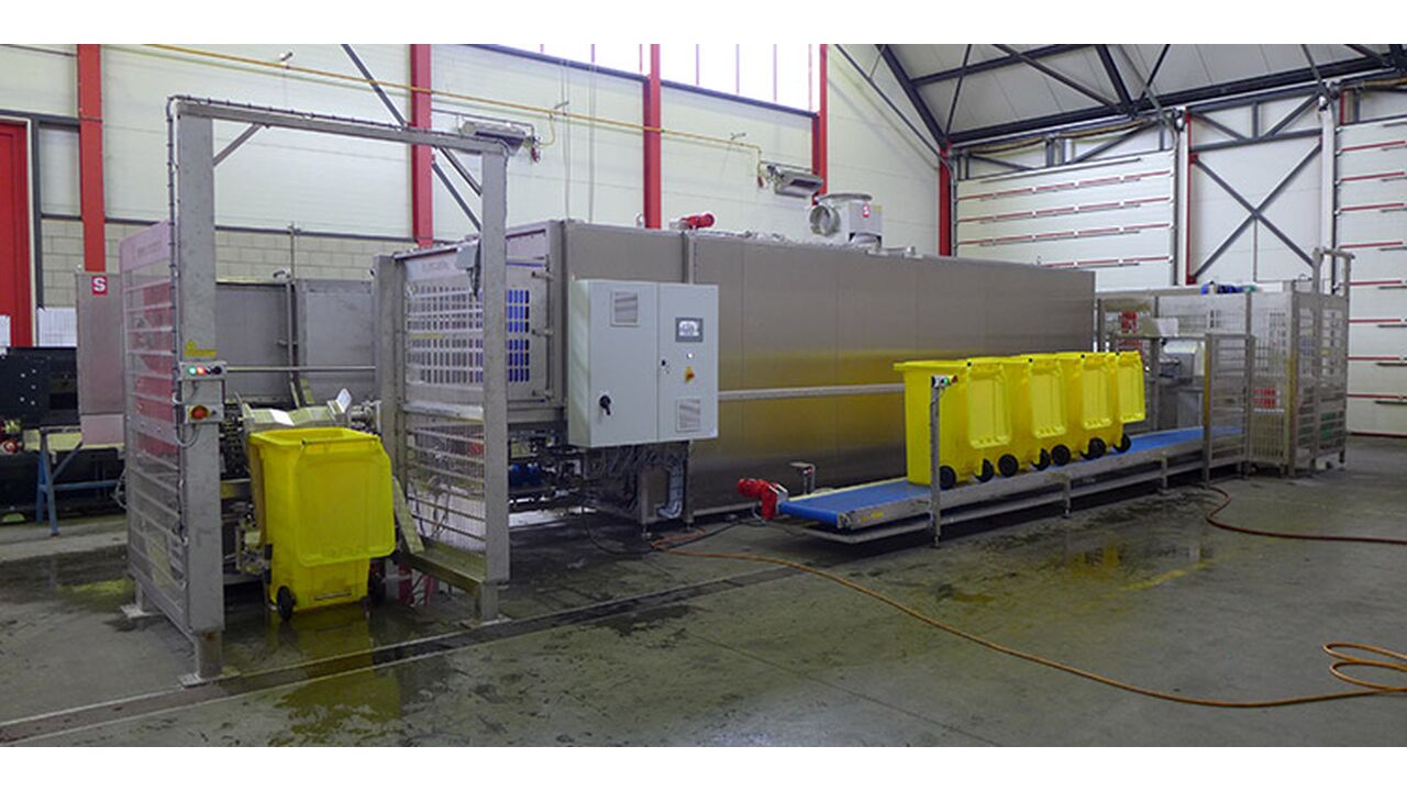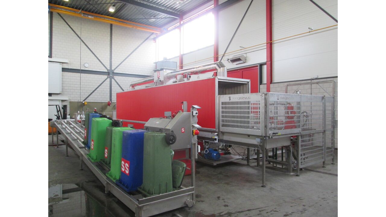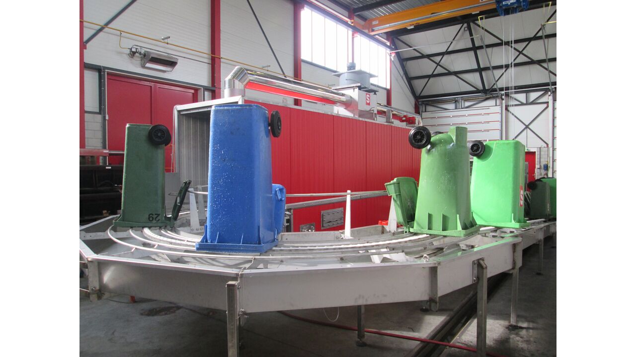 With a cleaning unit from Smicon, several types of containers/bins can be washed and cleaned. The bins are transported to and through the washing tunnel via a chain. Here they are cleaned using strategically placed spray nozzles. The system's insulated walls ensure that the washing machine works very energy-saving. In addition, water consumption is relatively low. The washing machine can be equipped with an automatic feeding and dosing system as well as a steam collector and can handle up to 300 bins per hour (depending on the type).